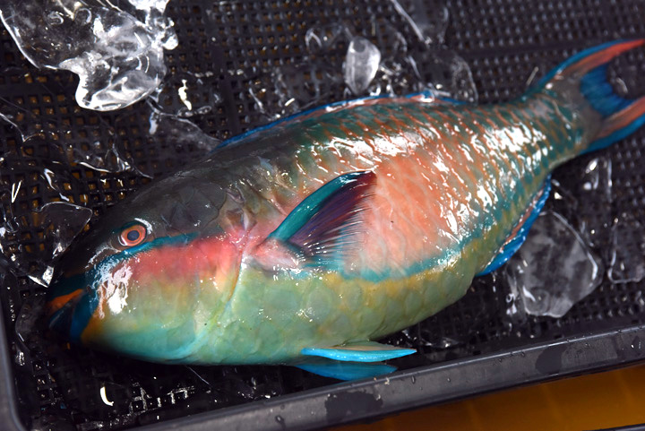 色鮮やかなイラブチャー(ブダイの仲間)など沖縄で獲れる近海魚をはじめ、カツオやマグロなどお馴染みの魚のほかに、イカやシャコガイなどの貝類とか、その日に水揚げされた海の幸がいっぱい!