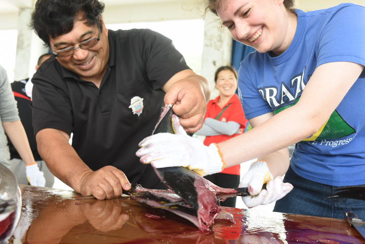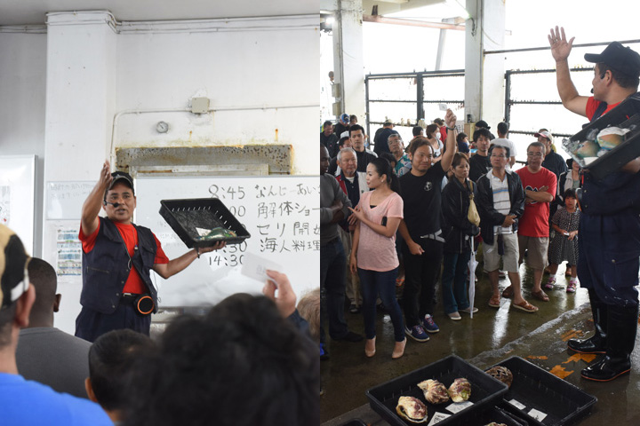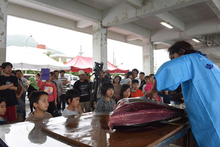 また、当日の朝に大きなマグロが水揚げされていたら、マグロの解体ショーを観ることもできます! 見事な包丁さばきに、集まった人たちもクギづけでした。