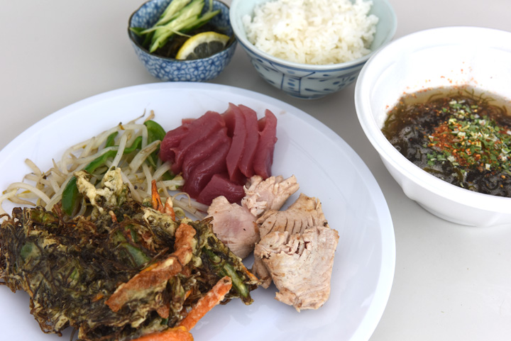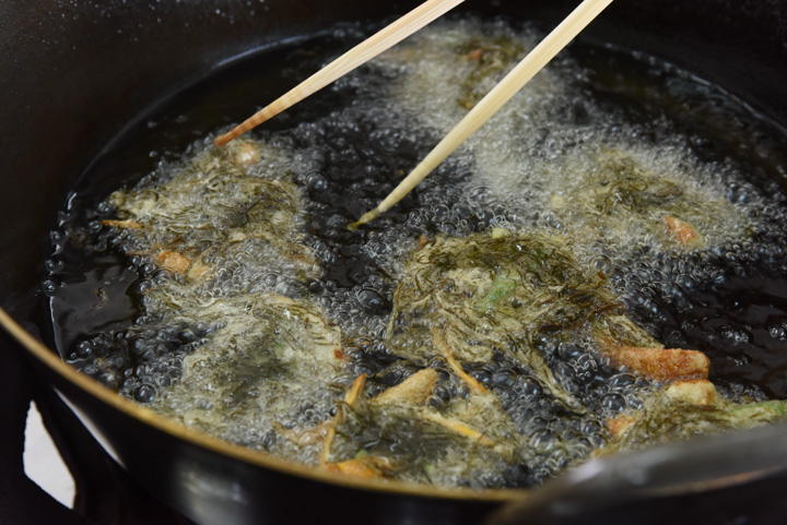 そしてこの日は『モズクの日』(4月の第3日曜日)ということで、今が旬の時期のモズクを、天ぷらや酢のものに調理する実習もありました。意外と簡単なのと、コツも教えてもらうことができたので、次からは自分でも作れそうです。