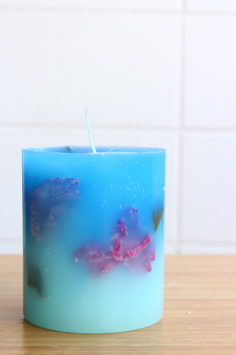 沖縄の海と空を思い浮かべる、この水色のキャンドルは、鮮やかなブーゲンビレアが浮かびます。まるで、それは軒先に咲くブーゲンビレアが青空の下、海風で揺れているみたい。