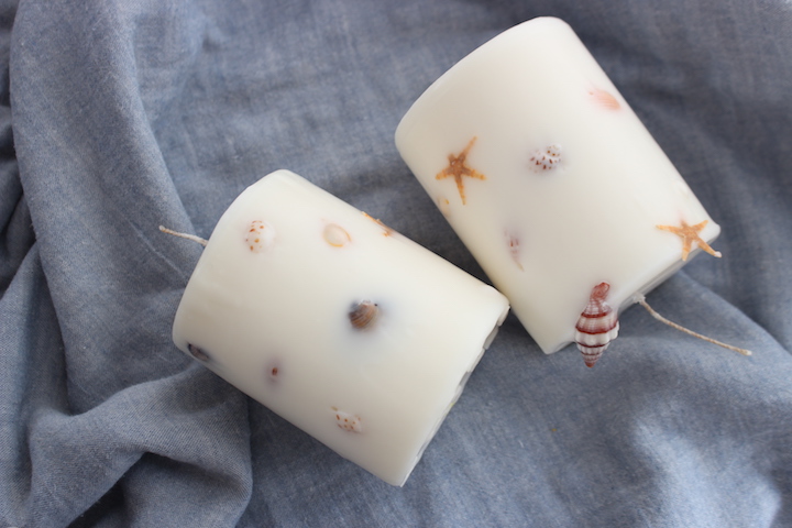 さらに貝殻が散りばめられたマットな白色のキャンドルも、ソイキャンドルという、大豆成分を主に使ったもの。白い砂浜に貝殻が転がっているのをイメージしデザインしたと、りんかさん。