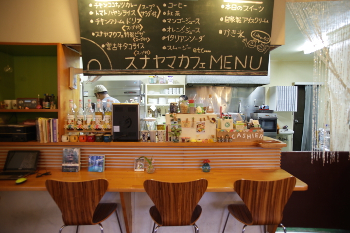 2009年オープンの『スナヤマカフェ』は、「出来る限り手作り」をモットーとしたシンプルな空間で、海遊びと日焼けに疲れた心身を、内から外から癒してくれます。