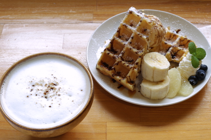 もちろん、食後はデザートをチェックです。イチオシは、まろやかな卵風味が活きる「焼き立てワッフル!」(650円税込。食事またはドリンクをオーダーした場合は500円税込)。熱々のふんわり食感は、自家製バニラアイスとの相性もばっちりで、しつこさを感じさせません。また、夏には宮古島産黒あずきを使った「宮古ぜんざい」(500円税込)も定番です。