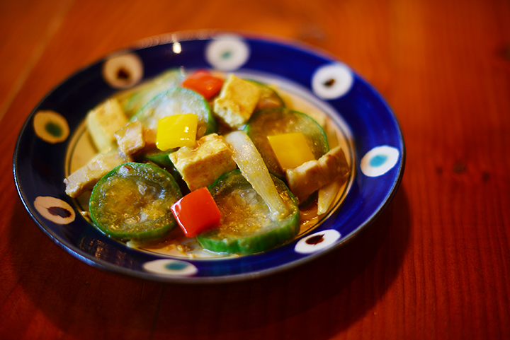 榮料理店の夏の定番メニュー「ヘチマの味噌カレー炒め」。