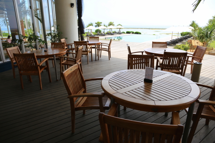 プールサイドのナイスなオーシャンビューが自慢のテラスでお食事も可能です。