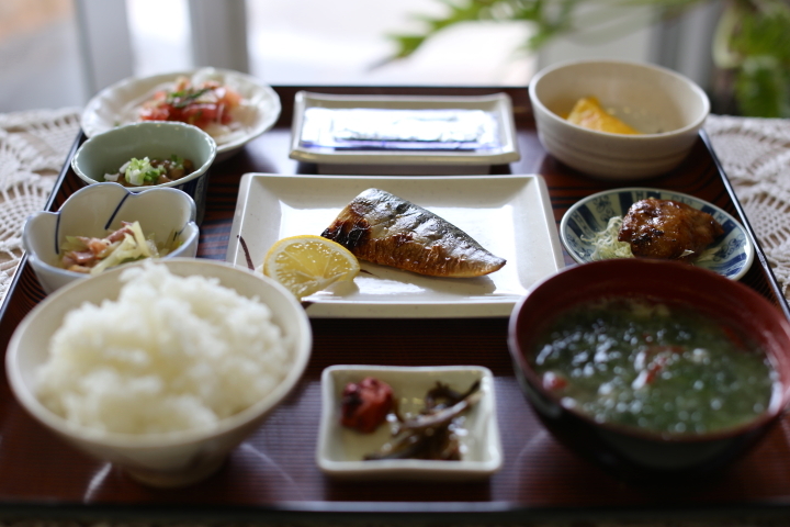 朝食ももちろん捕れたて鮮魚が中心です。この日は、サバの麹焼きの他、