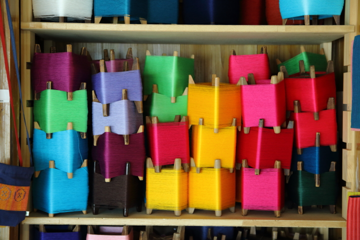 さまざまな染料によって、思い思いに糸を染め、手織りしています。