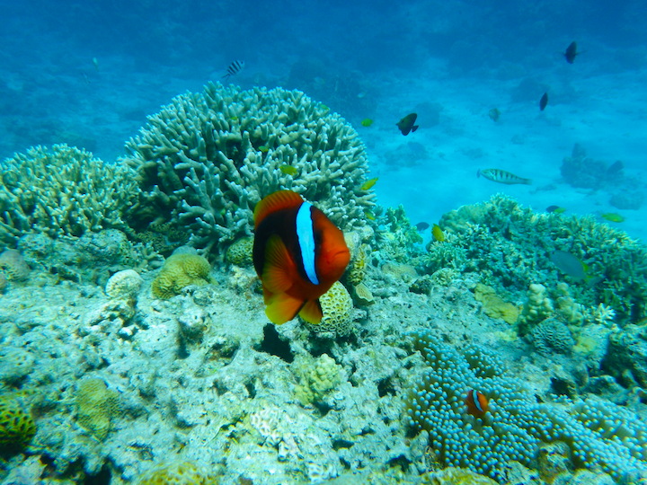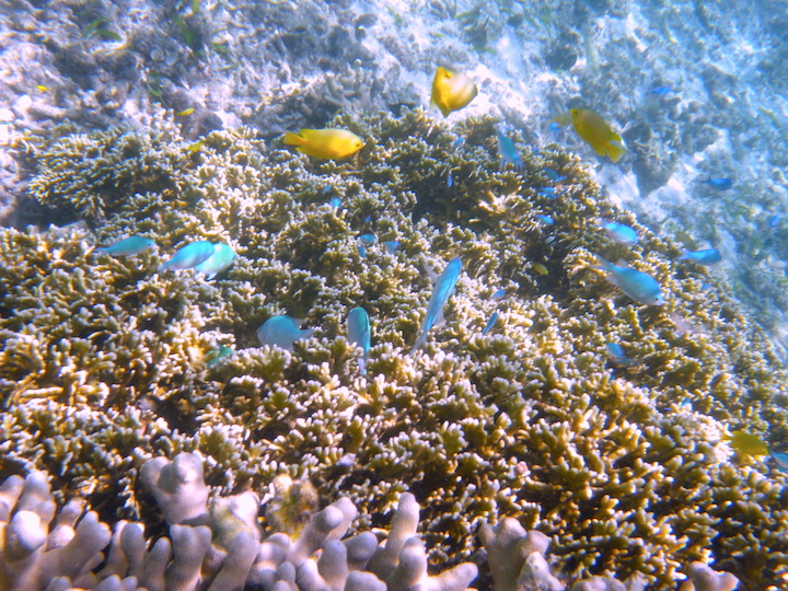 醍醐味は何と言っても、水中観察。遠浅のリーフ内に広がる豊富なサンゴ礁と魚影の濃さには、