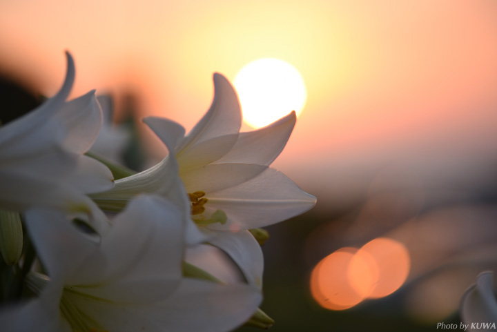 そのうち陽も暮れはじめ、白いユリの花が夕陽に染まっていきました。黄昏時の花畑はとてもロマンチックでしたよ。