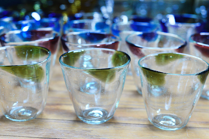 泡盛のビンなど、廃ビンの再生ガラスを使って作る琉球ガラスの器は、厚みがあるのが特徴。