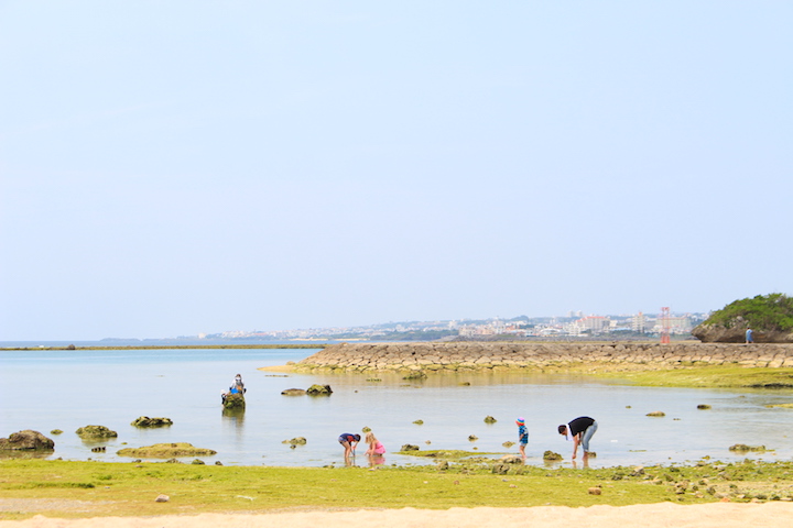 ビーチには、アーサーがあちらこちらにゆらゆら。黄緑色アーサーと海の青々とした色のコントラストが本当に綺麗で、この光景はこの季節ならでは。磯遊びをしていると、小さな熱帯魚が泳いでいたり、ヤドカリや、貝、カニを見つけることができます。小さな網を持っていざ、捕獲! と意気込む長女と私。いつの間にか、長女よりも真剣に、磯遊びにのめり込んでいる私が‥(笑)義理の父も少し離れた海岸で釣りを楽しんでいました。なんと、夕飯には、義理の父が釣ったコチというお魚が食卓に並びました!こういう一瞬一瞬に、本当に沖縄に移住してよかったな~っとしみじみ。