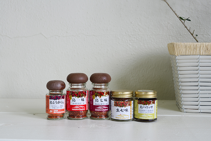 こちらは、石垣島の農事組合法人「石垣島海のもの山のもの」のスパイス。島ハリッサは、オリーブオイルに島とうがらしやクミンを漬け込んだもの。豊かな食材の旨味をお料理にプラスできる調味油です。そのほかにも、香り豊かな「生七味」や「島一味」、「島七味」など、島とうがらしを使ったおいしい調味料です。